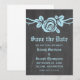 Sweet and pretty Rose Chalkboard Save the Date Announcement in light blue featuring a single lovely rose on a vine on a chalkboard look background. This elegant design is perfect for announcing your spring or summer wedding. Easy to customise, simply add your wedding details in the text fields provided. Click "Customise It" to find more personalisation options.
