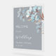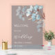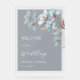 This elegant wedding welcome board features layered dimensional blue and gold flowers on a blue transparent background.