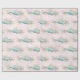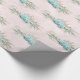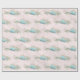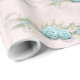 Wrapping paper with a repeating pattern of a photo of blue roses surrounded by sprigs and leaves and fancy baubles. The baubles also form a crown shape. White flowers and pretty blue bows and white lacy ribbon also surround the roses. Set on a dusty pink marble background.