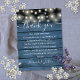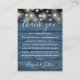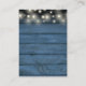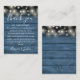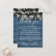 A rustic wedding celebration thank you reception card featuring pretty string lights on a blue barn wood panels background. Personalised with your special thank you message set in stylish typography. A special keepsake thank you for your guests. Designed by Thisisnotme©