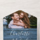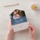 All in one photo wedding invitation with pretty string lights, mason jars, signature style names and chic typography on a blue rustic wood background. The invitation includes a perforated RSVP card that can be individually addressed or left blank for you to handwrite your guest's address details. Designed by Thisisnotme©