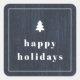 This rustic Christmas sticker features a blue vintage-inspired label design with space for a holiday greeting. There is a small pine tree illustration on top of the label, as well as a subtle woodgrain texture in the background. It was created to coordinate with the "Rustic Tree Woodgrain" Christmas card collection.