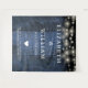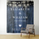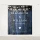 This blue rustic wood boho barn string lights wedding backdrop can be personalised with your information in chic typography. Designed by Thisisnotme©