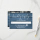 A simple elegant signature script RSVP card with your details set in chic typography and blue rustic wood panels, string lights and mason jars on the reverse. Designed by Thisisnotme©