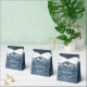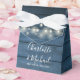 An elegant rustic wedding favour box featuring stylish signature script names and special date set in modern typography on a blue wood panels background with pretty string lights. You can personalise with your own thank you message on the reverse above two pretty mason jars. A perfect way to say thank you to your guests! Designed by Thisisnotme©