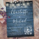 A stylish rustic wedding invitation postcard featuring pretty string lights, mason jars, signature style names and chic typography on a blue rustic wood background. Designed by Thisisnotme©