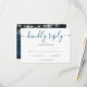 A simple elegant signature script RSVP card with your details set in chic blue typography and blue rustic wood panels, string lights and mason jars on the reverse. Designed by Thisisnotme©