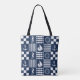 Navy blue patchwork pattern tote bag featuring geometric checks and stripes as well as seahorses, sailing boats, anchors, and ships’ wheels.