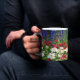 Enjoy your favourite hot or cold beverage in this coffee mug that features a wrap-around photo image of a colourful, summer garden of Blue Salvia and red and white Zinnias. A lovely, floral design! Select your mug size and style as desired.