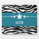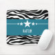 Trendy and modern Sassy Star Zebra Mousepad featuring a chic black and white zebra print background and a bold royal blue border adorned with a fun star motif. This girly design may be customised with the personalised text of your choosing. Click "Customise It" to find more personalisation options.