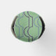 This bottle cooler has an art deco design of blue and purple half circles connect with lines on a field of light green.