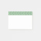 This Post-It notepad has an art deco design of blue and purple half circles connect with lines on a field of light green.
