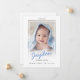 Modern birth announcement template card for baby boys. Add your first photo on the front of the card in the stylish white frame. Your child's first name can be added in blue script font. The child's middle and last name and birth stats follow. You can add the second picture of your baby to the back of the card along with the parents' names.