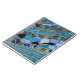 A turquoise blue mosaic with black, blue, light green, gold, grey, and white coloured sea glass.
