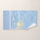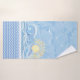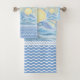Mood-setting coastal chic bath towel in subtle blues and graphic watercolor ocean waves, are punctuated by the yellow and orange rays of the sun. While white seagulls sail in a watercolor sky.