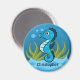 Cute magnet featuring a blue seahorse in an underwater scene. Below is a template to add your name to personalise.