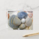 Blue seashells photography postcards. Tropical shells photography includes four cockle shells of blue and tan arranged in a circle with a white moon snail or shark's eye shell in the centre. These seashells came from the Florida gulf coast.