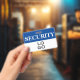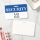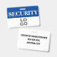 This custom identification badge features a blue and white design with the title "SECURITY" printed in a large white font over a blue background. A sample company or business logo is placed in the centre which you can replace with your own custom logo or other image. The back of the security guard ID badge contains contact details and additional information.