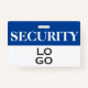 This custom identification badge features a blue and white design with the title "SECURITY" printed in a large white font over a blue background. A sample company or business logo is placed in the centre which you can replace with your own custom logo or other image. The back of the security guard ID badge contains contact details and additional information.
