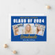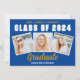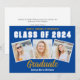 This trendy blue, gold, and white custom senior senior portrait photo collage graduate announcement card features varsity letters for the Class of 2026 under your college or high school name. Customise with your favourite 3 graduation photographs and personalise the back with commencement details.