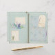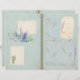 Pretty, shabby aged, blue paper with a collage of parchments, faint blue lines and lilac flowers. The back of this paper has a matching pale blue, aged paper design.