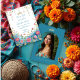 This vibrant and lively design features a floral border inspired by Spanish and Mexican traditions, crafted in a delicate embroidery style. The composition includes colorful flowers, leaves, and ornamental details surrounding the central space, highlighted by an elegant tiara on the front, symbolizing the quinceañera and her special role in the celebration. The bright colors and detailed patterns bring energy and visual richness, creating a joyful, sophisticated, and festive design.