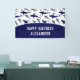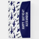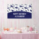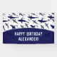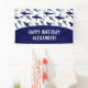 Add a touch of the ocean to the birthday party of your little boy with this custom blue and white shark pattern banner sign. Sign has cute sharks swimming in the sea, the text Happy Birthday, and your little one's first name.