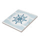 This ceramic tile has a nautical theme with soft blue chunky stripes in the background with a rope design in the middle. Centred is a white frame with a light blue nautical ship's wheel. Some design elements are copyright Graphic Market