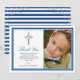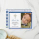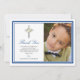Elegant first holy communion thank you cards featuring a simple white background that can be changed to any colour, a navy blue double border, a religious silver cross with white flowers, a photo of your child, and a modern thank you template that is easy to personalise.