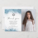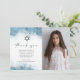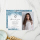 This elegant modern photo bar or bat mitzvah thank you card features a light blue watercolor border design in imitation of marble veined with faux silver foil, fading gradually into the white background. A small Star of David appears above the words "thank you" in charcoal grey handwriting script, with an editable message below in serif capitals. Easily replace the sample image with your favourite photo. The reverse side features a matching blue and silver marble design.