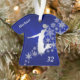 This Holiday ornament features a silver silhouette basketball player dunking the ball in front of a spray of ornate silver snowflakes. The image is placed on a gradient deep blue background. Your custom text is in silver on the left sleeve, and at the lower right. The back of the ornament has the same blue background and snowflakes, and additional text fields for you to customise. Perfect for the basketball player or fan.
