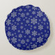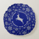This festive Christmas pillow features a silver snowflake pattern on dark royal blue background. The matching blue centre has a silver reindeer image in the centre of text that says Merry Christmas and Happy New Year. The other side has the same snowflake pattern, but without the circle or reindeer text. Beautiful decor for the Holiday Season! *Please note - the image is printed and does not contain glitter.*