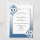 On front: A classic blue and white gradient ombre background with a faux silver frame. Decorated with watercolored flowers, florals in shades of blue. Templates for the bride and groom's names and party details. The names are written with a modern hand lettered style script, blue coloured letters.