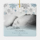Celebrate baby's first Christmas with this elegant personalised blue and silver snowflake ornament. This ornament is fully customisable! You can edit the text and add your own photo by clicking "personalise this template". This personalised baby's first Christmas ornament feature a custom photo of your baby and space for your baby's name and the current year. Hand drawn icy blue, white, and silver glitter snowflakes are clustered around the top as a cute winter frame and the text is in grey. Classic blue and silver Christmas colour scheme make this photo keepsake ornament festive but classy.