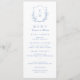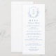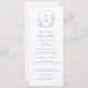 Monogrammed initials framed by elegant crest and hand illustrated botanical leaves, menu details in elegant script and classic font, simple and luxury. Great blue and white menu for modern classic wedding, simple formal wedding, elegant botanical garden wedding.