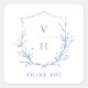 Monogrammed initials framed by elegant crest and hand illustrated botanical leaves in blue and white, simple and luxury. Great thank you favour stickers for modern classic wedding, simple formal wedding, elegant botanical garden wedding.