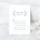 Rustic hand illustrated botanical leaves wreath and modern classic font in blue and white, Simple and elegant. Great RSVP card for modern classic wedding, simple formal wedding, elegant botanical garden wedding.