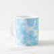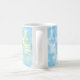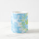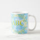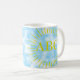 Sunbeam style drawing with monogram. Custom coffee mugs. Blue sky pattern in the background.