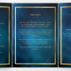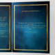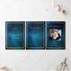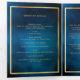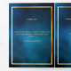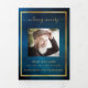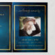 An elegant tri-fold program. A dark blue sky as background, a faux gold frame and space for your photo. Personalise and add name, dates and your text.