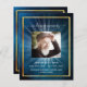An elegant 2-page program. A dark blue sky as background, a faux gold frame, and space for a photo. Light beams behind the photo. Personalise and add name, dates and your text.
