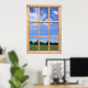 It's summertime and a beautiful day in the park with a blue sky of fluffy white clouds. Framed by a wood window frame, you can see the green of the park lined by trees, and in the foreground a sandy dog enjoying the wide open space that is a true dog heaven. Put it on the wall of your home or office for a fake window with your own park view.