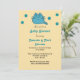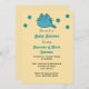 A cute cartoon drawing of a blue smiling kitty cat surrounded by some blue teal dots on a baby shower invitation.