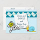 This is a cute and economical way to announce a boy toddler birthday party. The front of the post card features a cute design of a cartoon puppy, a snail, a turquoise, orange and green polkadot zigzag banner, and a white announcement that says "Snips and snails and puppy dog tails!" The images are placed on a light blue background. The back of the post card holds your customised party information. Cute!
