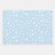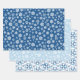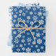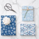 Here's a pretty blue and white Holiday series of wrapping paper. One paper has white ornate snowflakes on a field of medium blue. Another one has the same white snowflake pattern on a light blue background. The third one has a pattern of matching blue antlered reindeer heads combined with snowflakes, all on a white background. All coordinated in matching colours.