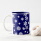 A nice sober Holiday gift for your Christmas mornings or afternoon tea with white snowflakes on a blue background. Customisable. Choose your style of mug. Other colours available, as well as matching ties, cards, invitations, ceramic tree ornaments, labels, etc.