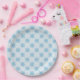 Paper plates featuring blue snowflakes in a square diagonal pattern against a light blue background. Perfect for a fun wintry / Christmas holiday party.