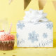 Christmas gift wrapping paper feature snow flakes, modern calligraphy merry Christmas script and personalised text in winter blue and white.
