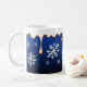 Hot chocolate is dripping down this festive deep blue snowflake mug. The designs are from original art.