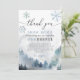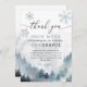 Elegant winter birthday party thank you card featuring watercolor illustration of blue snowy mountain with pine trees and snowflakes. The text says "thank you snow much for making my 1st birthday ONEderful." Perfect for a boy's first birthday.