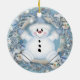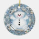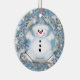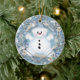 This adorable Christmas ceramic ornament, features a silver blue and white wreath and a cute snowman wearing blue gloves and a blue Christmas hat.
